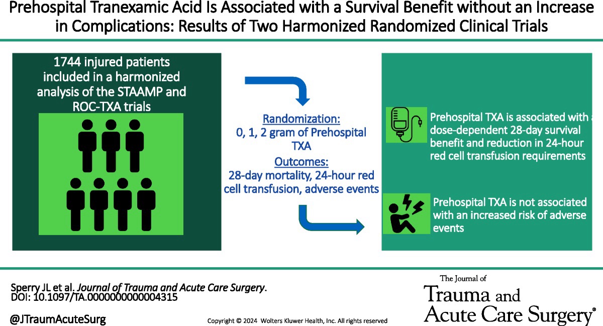 MATTERs was a retrospective, observational trial that compared TXA administration with non-TXA administration in combat casualties receiving at least 1 unit blood. They also evaluated a subset of patients receiving a massive transfusion. There were 896 consecutive patients with a combat wound, of which 293 received TXA. Their findings in the TXA group demonstrated a lower unadjusted mortality (17.4% vs. 23.9%; p=0.03); benefit greater in patients receiving MT (14.4% vs. 28.1%; p=0.04) Their conclusion said TXA was independently associated with survival (OR=7.7228; CI 3.016-17.322).