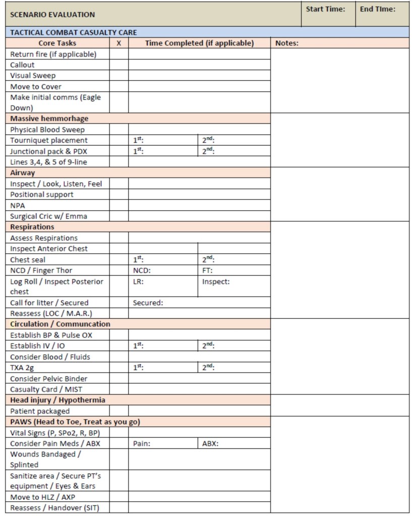 If your organization uses a checklist, we highly encourage you to get together as Cadre to ensure it is adequate and there is room for good medicine; Establish a scoring system or grade instead of a checked box, with time hacks for each section, and individual interventions themselves. We already discussed the benefits of assigning a grade instead of checking a box above so no more on that point. On the other hand, a well done grading sheet can help new NCO’s and novice instructors without much conscious experience to give students a fair, consistent examination without forgetting key concepts. A weak checklist makes even senior instructors focus on less important details instead of key concepts, holding them back from growth as a proctor. You see this when medics run a great lane, but the instructor is berating them over something minimal they did that’s not as serious as a failed hemorrhage control attempt or a botched cricothyroidotomy. The truth is a good instructor will know that everything on a checklist is not equal, and some things save more lives than others.