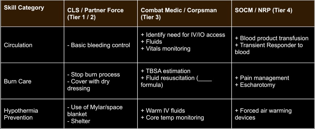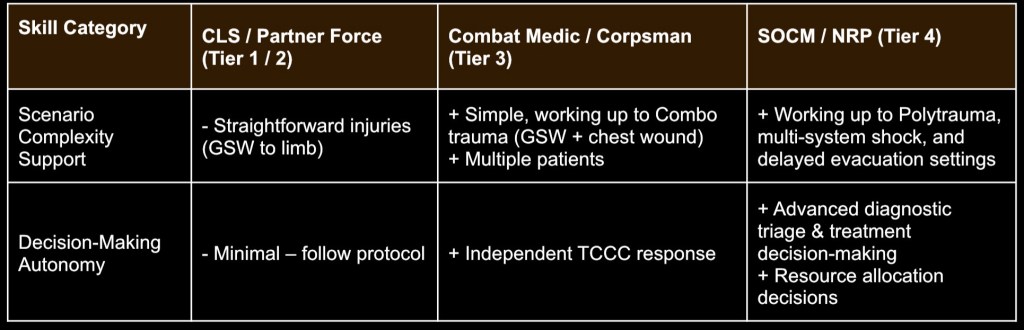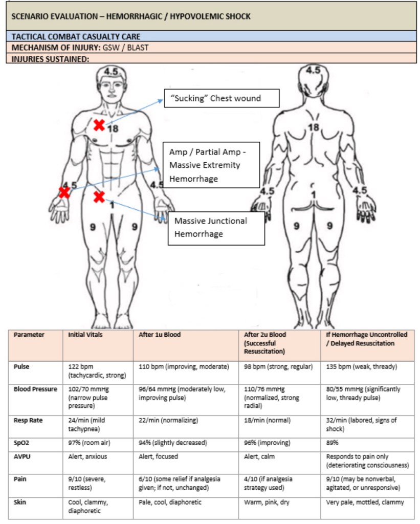 For example, Let’s say you want to test him on proper tourniquet application (and time), wound packing and blood transfusions; we would make a wound on an extremity, add a junctional injury (on an exact location where we can feel that artery pulsate), then give our medic vitals that lead them to doing a blood transfusion after he assesses his patient.That is a good 2-3 critical criteria. They don’t need to do something intense for every letter of MARCH and PAWS. Stick to 1-2 bleeds and another intervention for the most part. Consider only 1–2 major injuries max per patient (especially CLS or non-US Partner Forces). Overloading lanes creates chaos, not learning.4,6