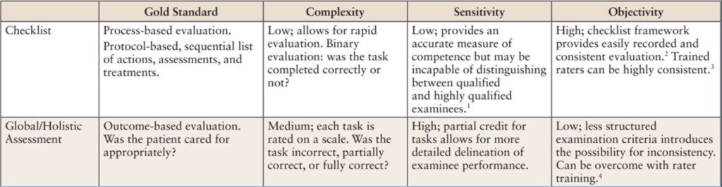 Bottom line up front: Recognize checklists are limited tools that need to be honestly scrubbed for accuracy. If your Cadre notices that students are doing bad medicine yet technically passing the grade sheet, or critically thinking but failing, then find ways to enable what is best for patient care. Checklists are not the gold standard in most cases. However, most medic instructors do not have the experience or education to properly grade a lane without some guidance, or they may be forced to use them due to unit/schoolhouse SOPs. Therefore, If you’re going to use one, make them better.The table below provides characteristics of commonly used evaluation methods in medical training.14,15,16,17