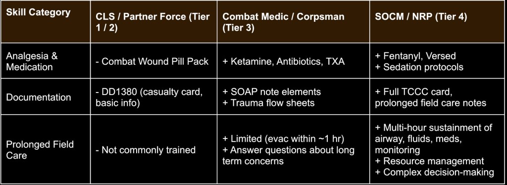 For instance, Medic controls junctional bleeding, provides resuscitation, proper pharm administration, gets airway and then considers bilateral finger thoracostomy based on wound set. 95% of the lane should not be the value of “people die”, which does not take a genius to figure out. Training can not impart that degree of heavy impact, and certainly is not as important as scenarios we can train on how to SAVE lives. Additionally, the context of this scenario matters. If doing this in front of a group of medics as an evaluation, they may understand what is happening. If you decide to throw a “no win” scenario at a medic and his patient dies in front of his infantry platoon, you may ruin their reputation with the unit as they may see the roleplayers death as negative feedback due to medic messing up, which is morale crushing. Once again, being an instructor is mastering your craft and intentional context, not just random training and scenarios. If in a MASCAL, then of course expectant patients are a consideration because more is going on, but as the single TCCC patient it’s low value. If this is during PFC, then the lesson could be running and managing a code and considering H’s and T’s, ROSC management (yes they can code and come back) or even palliative care after telemedicine. This should be avoided, or one minor aspect of the training in this niche example of including it. Remember the first point in this article, training must have an objective.