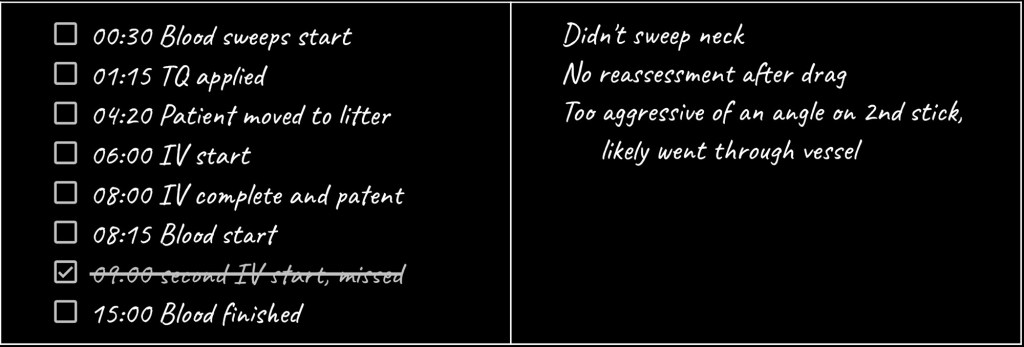 If there is a major mistake, I annotate it next to the skill. If I have a thought I want to say at the end I also write that down. Time stamps are a mandatory part of grading TCCC lanes and interventions as written above, not just the final time of the entire lane. You can have a great lane time overall, but a 5 minute IV time, 4 minute cric, or similar slow intervention time. If an Instructor fails to track time, they can not show a student how slow that intervention was to provide feedback. This means a student does not get an opportunity to grow. With some sources suggesting a ~5% mortality11 impact per minute with delays in resuscitation of some trauma patients, every minute counts and we should be avoiding small interventions that delay blood. Every minute spent chasing needle decompressions or fumbling with gear is room for improvement.